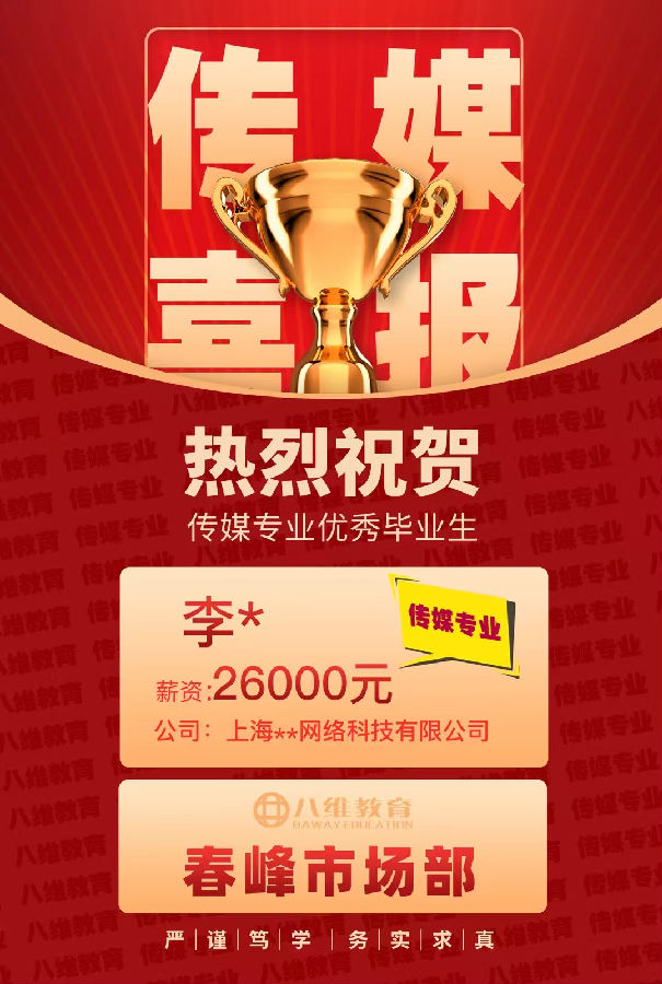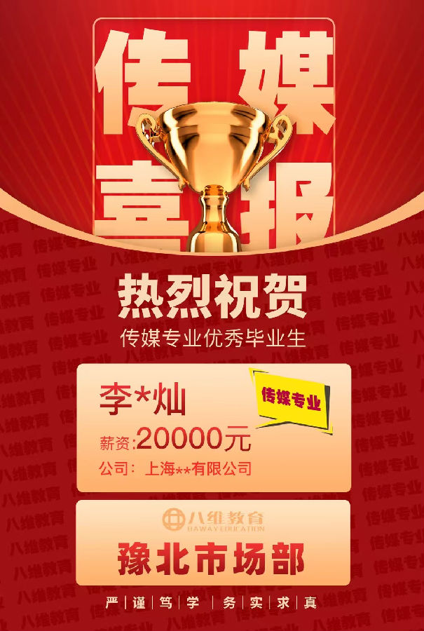八维教育与众多传媒企业建立了长期稳定的合作关系,到新兴的互联网媒体平台,都与八维教育有着密切的人才输送合作,在学生学习过程中,学校会定期举办企业宣讲会、招聘会,让学生有机会与企业面对面交流,提前了解企业需求,而且八维教育还为学生提供就业指导服务,从简历制作、面试技巧培训,到职业规划咨询,全方位助力学生顺利就业,据不完全统计,八维教育传媒专业的毕业生就业率连续多年保持在较高水平,许多学生毕业后都能进入心仪的企业,开启自己辉煌的传媒职业生涯,当下八维教育传媒专业4月份就业喜报来袭!